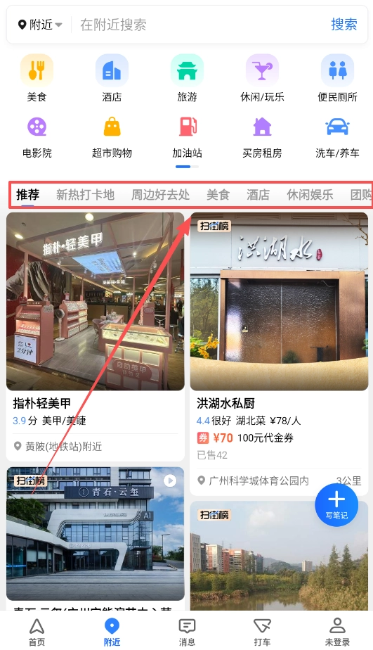 2、使用附近功能探索周边,从便民厕所到洗车养车都列得很清楚,点开分类查看商家详情和评分,日常需求轻松解决。