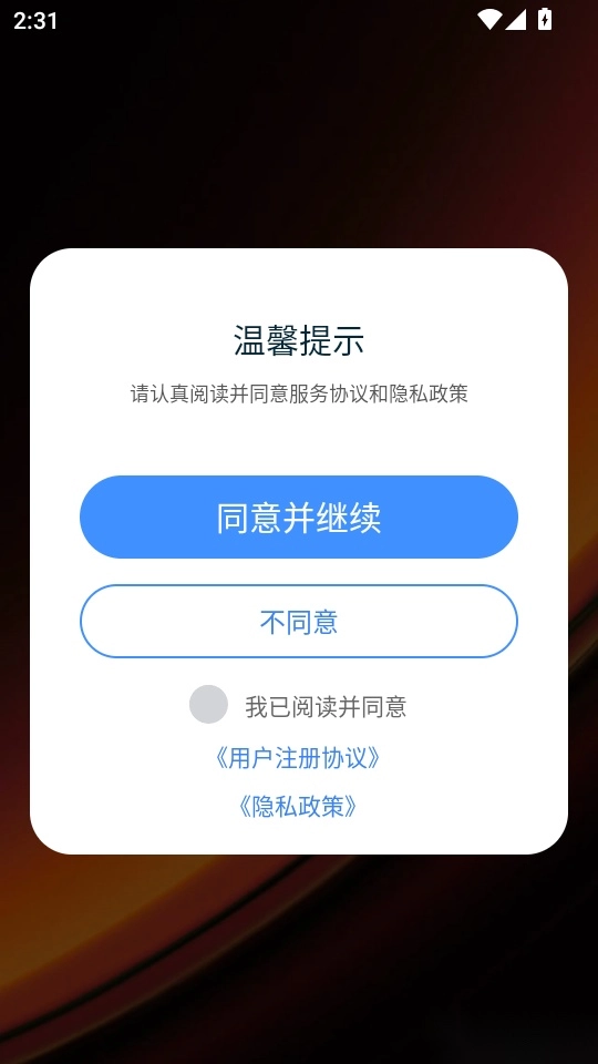 1.首先打开软件阅读“温馨提示”后,点击“同意并继续”按钮进入