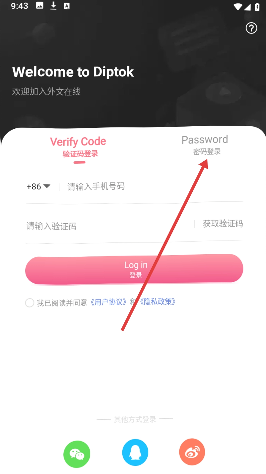 2、在登录页面选择【密码登录】,进入密码登录页面。