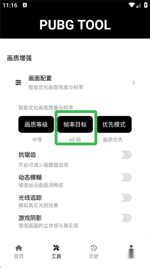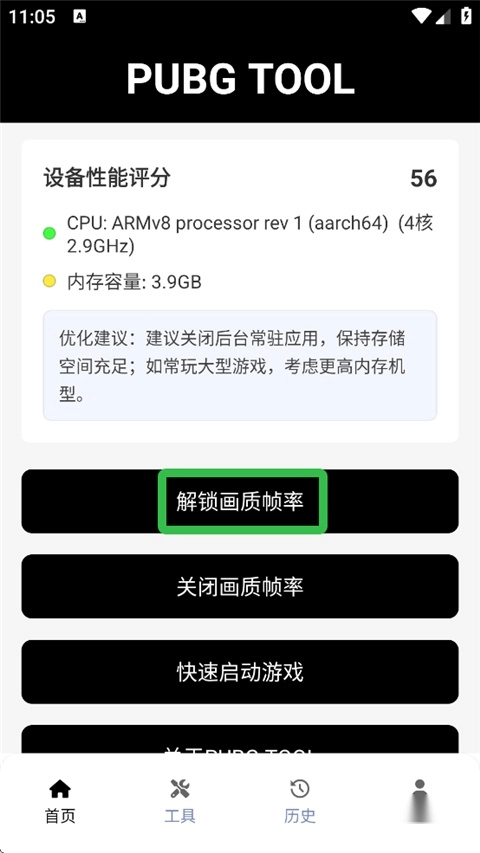1、进入PUBG画质助手正版,点击【解锁画质帧率】。