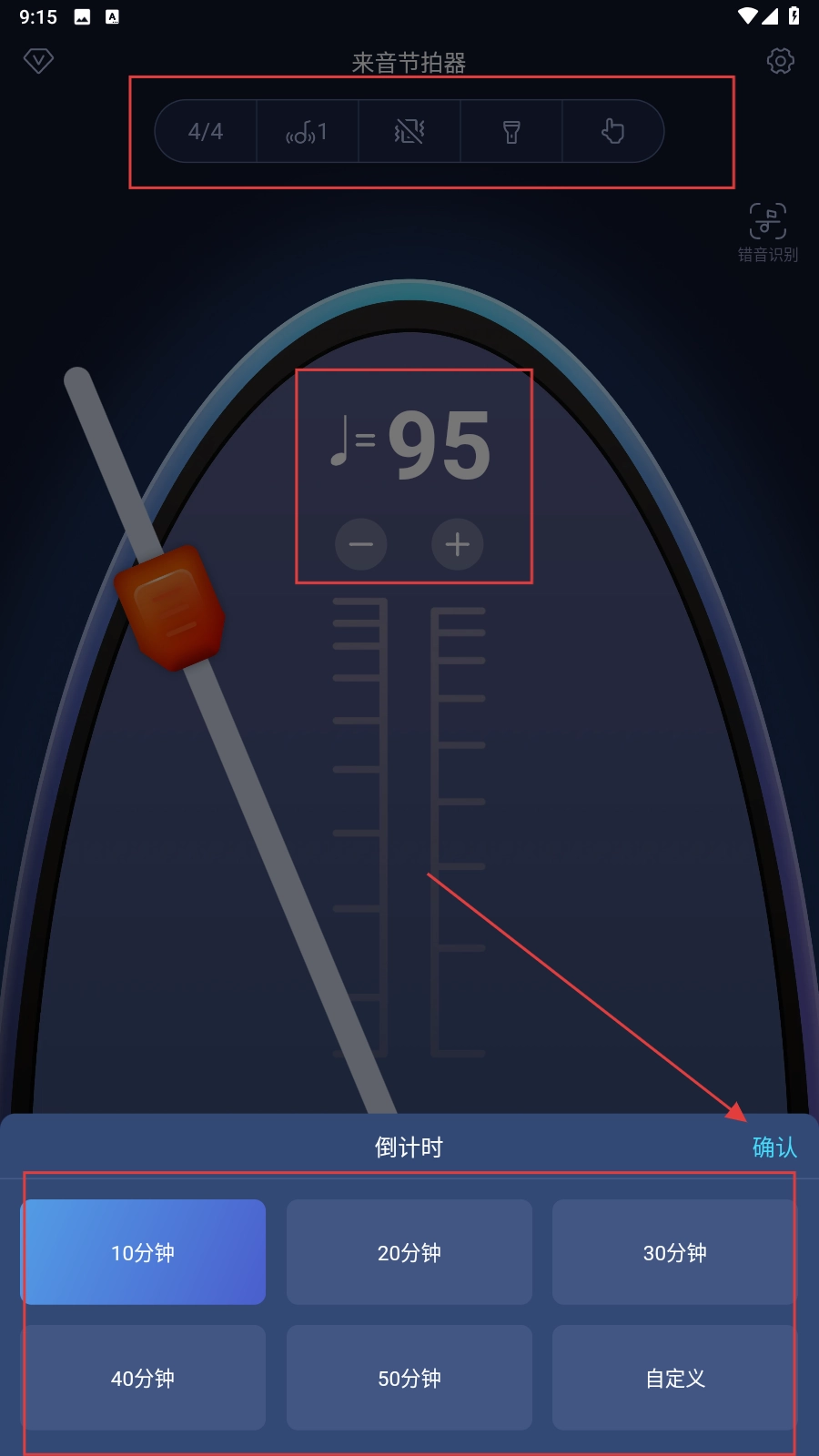 1、打开应用,在节拍器页面设置节拍与倒计时,点击【确认】按钮后,进入参数设置环节。