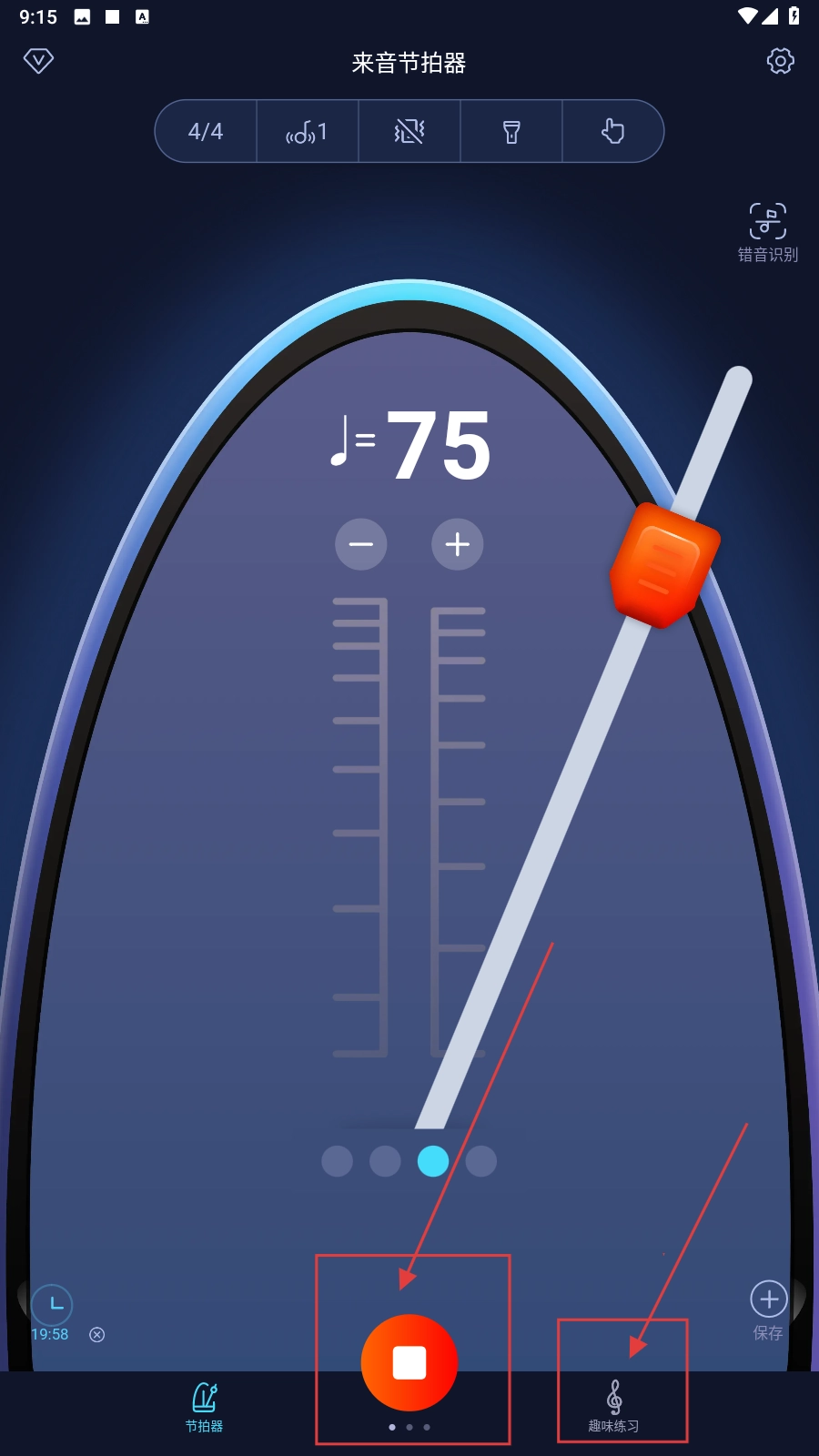 2、点击【开始/停止】按钮控制节拍器运行,再点击【趣味练习】,进入练习模块。