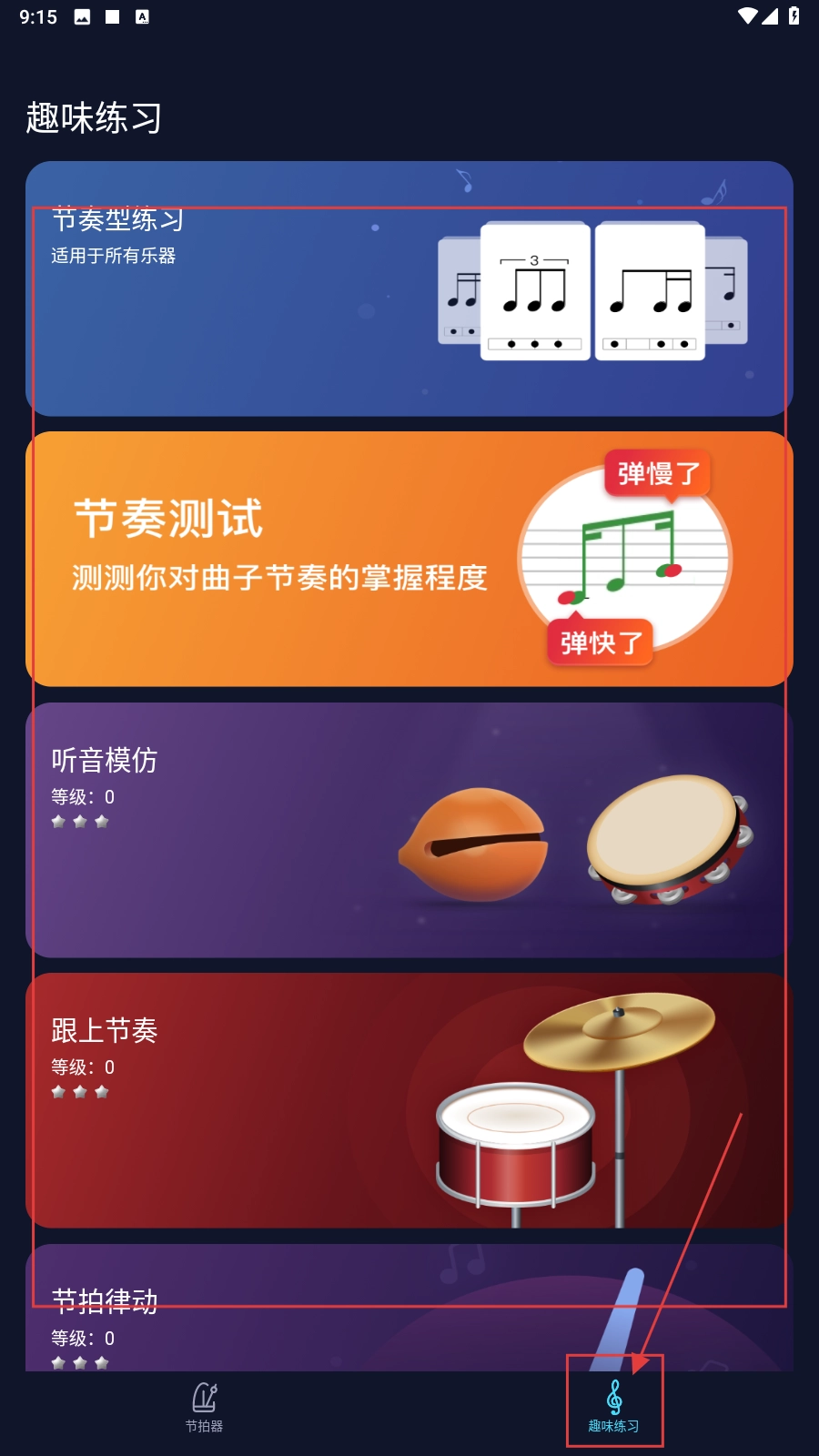 3、在趣味练习页,选择练习类型(节奏型练习、节奏测试等),即可进行音乐节奏练习。