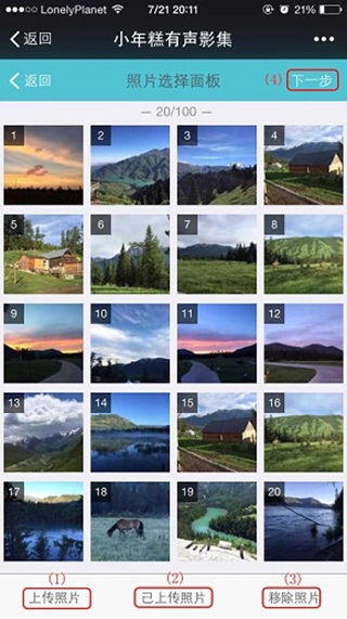 (1)点击“上传照片”从手机相册上传照片。一次最多上传9张,但可上传多次。