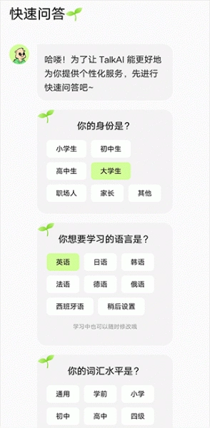 2、请根据您的身份、目标学习语言以及当前水平,选择对应的选项,以便我们为您提供更精准的服务。