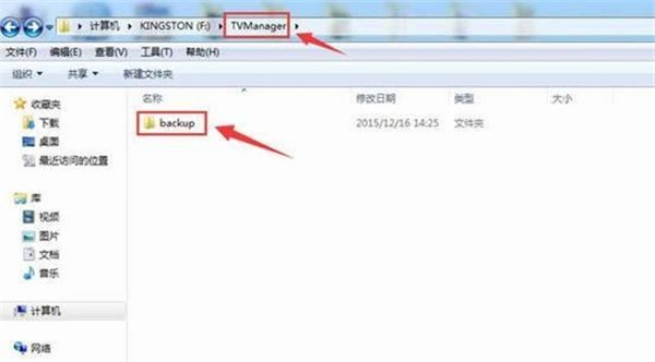 2、在U盘内创建一个新文件夹,将其命名为TVManager;接着打开这个TVManager文件夹,在里面再新建一个名为backup的目录。