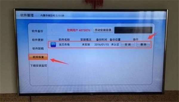 4、把U盘连接到电视上,打开应用中的电视卫士,选择软件管理里的软件恢复功能,找到当贝市场APK,点击安装就可以了。