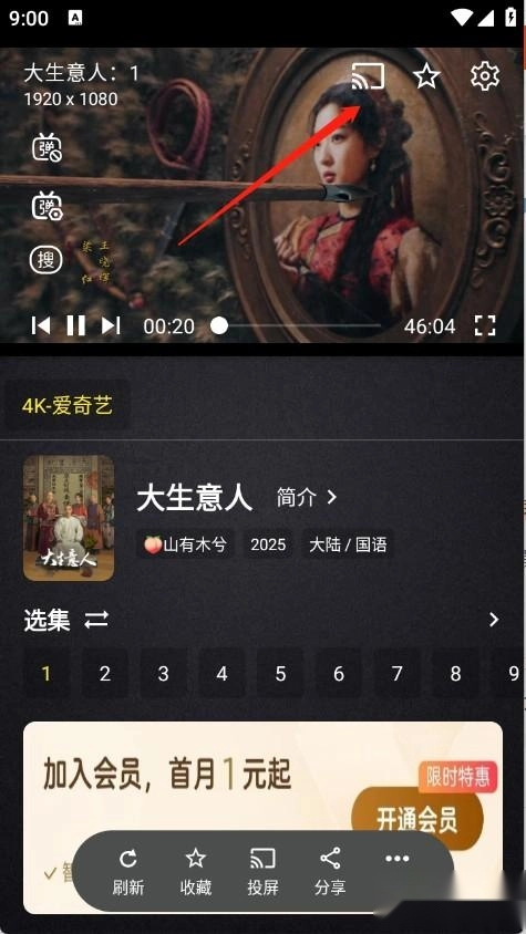 1、打开想观看的影视内容,进入播放界面后点击右上角的投屏按钮。