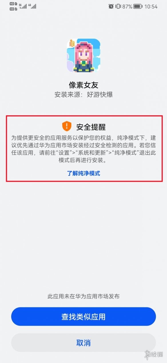 华为鸿蒙系统开启纯净模式后,会限制软件安装来源,仅允许从系统自带的华为应用市场安装;若尝试通过快爆、浏览器、应用宝、百度手机助手等非华为应用市场的平台安装,均无法正常进行。解决此问题的方法很简单,只需关闭纯净模式,就能在快爆里正常安装游戏了。