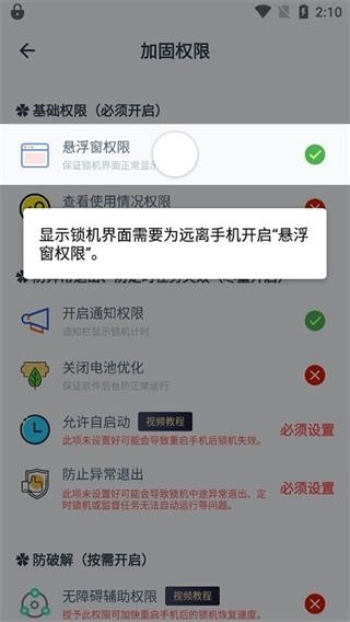 2、显示锁机界面需要为远离手机开启“悬浮窗权限”