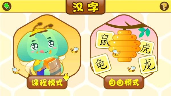 3、点击进入汉字,用户可以在可以在这里进行汉字的学习,软件为用户提供课程模式和自由模式两种学习模式,用户可以自由选择。