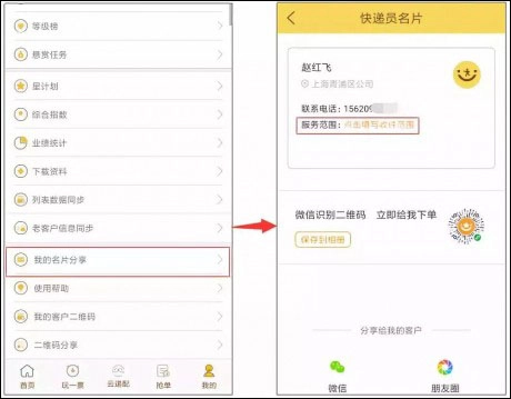 进入韵镖侠-我的-我的名片分享,维护收件范围。