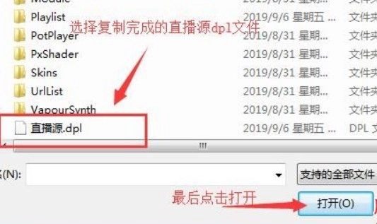 在potplayer文件目录中选择“直播源.dpl”文件,点击打开,如图