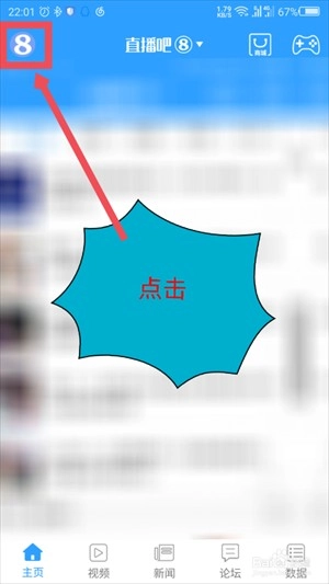 打开直播吧软件后,在软件的主页界面,点击左上角那个形似“8”字的个人头像图标,具体位置可参照图示。