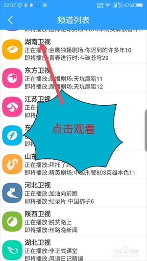 在打开的电视频道列表里面,可以随便选择一个卫视频道,点击观看电视频道直播。如图所示