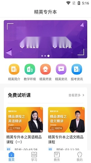 1、首先在手机上打开精英专升本,界面上包含精英简介、教学环境、精英师资等内容,具体可参考下图;