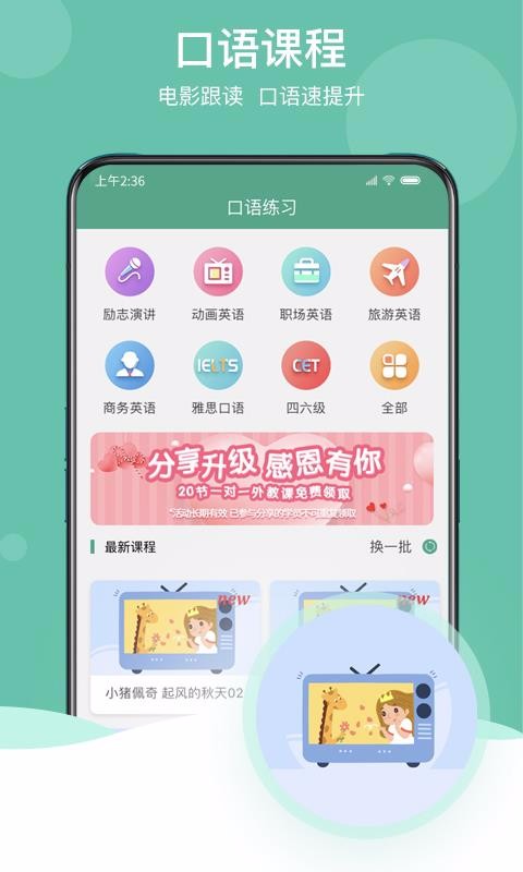 口语课程提供励志演讲、动画英语、职场英语等丰富多样的选择。